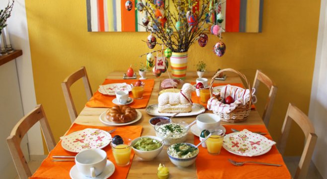 Masa tradițională de Paște se ia în familie fiind nelipsite friptura de miel, drobul, pasca, ouăle roșii și cozonacul.